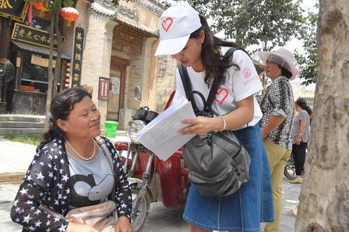 大概走访了解了一下袁家村的基本情况后,队员们就分2小队,分别从两条主要街道开始了调研活动。冒着炎炎烈日,队员向当地居民及景区游客发放问卷,了解景区发展状况,经营状况,对周围的影响等内容。多数受访者对三下乡队员的实践活动给予了积极的配合和真诚的鼓励。虽然有酷暑的考验和部分游客的误解,但队员们仍能尽全力克服困难完成调研。