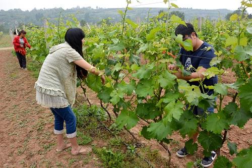 杨陵君度农业专业合作社位于杨陵区崔西沟、元树村北坡、韦河南岸一线,主要以农业综合种植、采摘、休闲观光、生产为主。当天上午,抵达目的地后,合作社的负责人热情的接待了“田园使者”一行人,并带领同学们参观了葡萄科技园、葡萄良种培育园、君度办公及唯尔酒庄、葡萄观光垂钓、天然养殖园、绿化苗圃、葡萄观光长廊等。在参观的途中,同学们看到园区的工作人员正在对葡萄的枝叶进行修剪,同学们便主动的要求参与其中,希望能够做一些力所能及的事情。于是在负责人和果农的指导下开始学习修剪葡萄枝,并帮助合作社进行了葡萄枝的修剪与护理工作。学习之初,我们提出了许多相关的问题,负责都一一进行解答,并对同学们的学习能力表示赞赏。