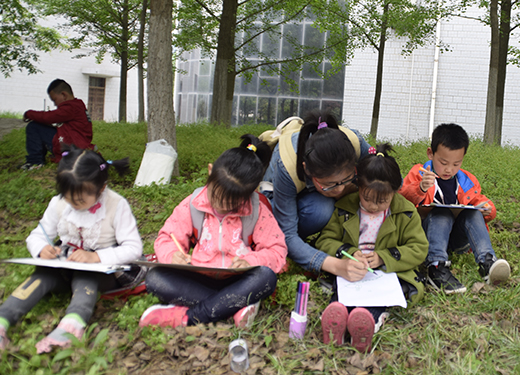 欣赏完牡丹,老师和志愿者们便带着小朋友来到槐树园写生。每个小朋友领到自己的画板、纸和彩笔,坐到台阶上开始作画。在他们丰富的想象力下,绿树、红花、蓝天、蝴蝶跃然纸上。志愿者亲自给小朋友们示范牡丹的画法,耐心的指导讲解。小朋友之间互帮互助,共同完成他们的艺术品。画纸上各式各样的花纹图案,无不表达着他们内心纯真、善良、富有想象力的特点。路过的人纷纷驻足观看,被这一片和谐之景感染。身处自然之境,小朋友好动的心也变得宁静,他们用最纯净的眼睛捕捉风景,用最稚嫩的画笔描绘美好。
