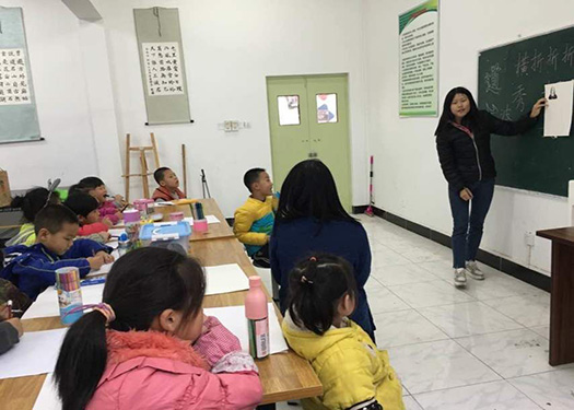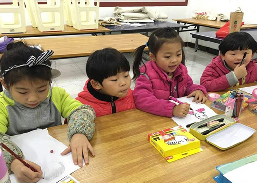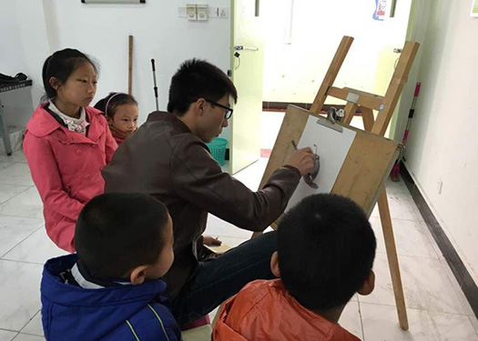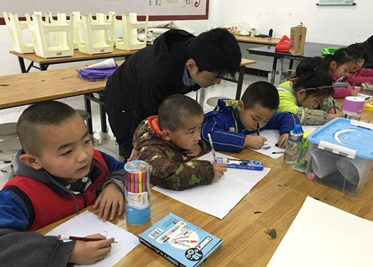 在志愿者与活动中心负责人详细沟通并制定教学计划后,志愿者做好了充分准备,便开始上课。在志愿者的带领下,小朋友们有条不紊的准备画画所需的工具,并且手把手教小朋友削铅笔/裱纸等。整个气氛其乐融融,为深秋增添了一丝暖意。工具准备完毕,志愿者小老师在画板上详细的示范作画并深入讲解,小朋友们心无旁骛地观看听讲,时不时提出问题,老师也一一耐心解答。冷风习习的秋天阻挡不了小朋友们一颗颗炽热好学的心,他们专注的目光让旁听的人为之动容。