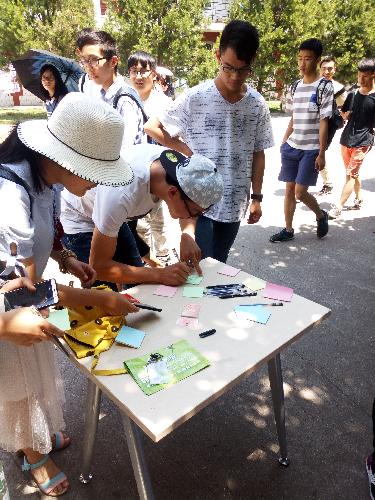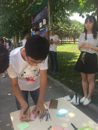 心咨部的同学们绘制了“放飞心愿纸鹤”展板树立在西雕附近,准备好了笔和五彩缤纷的便利贴邀请路过的同学们写下自己的心愿。“希望自己可以过六级”、“希望期末不挂科”、“想快点儿找到女朋友!”、“希望自己永远吃不胖”、“游泳课之前减到100斤”、“高数成绩80+”……路过的同学们纷纷停下脚步,在各色的便利贴上写下自己的小心愿,也有一些同学写下了对他人的祝福:“宿舍长越来越帅”、“宿舍全部过四级”、“祝林宝宝马上找到男朋友”等等。同学们怀着憧憬与向往将写着心愿的便利贴仔细的贴到展板上,在展板前合影留念。