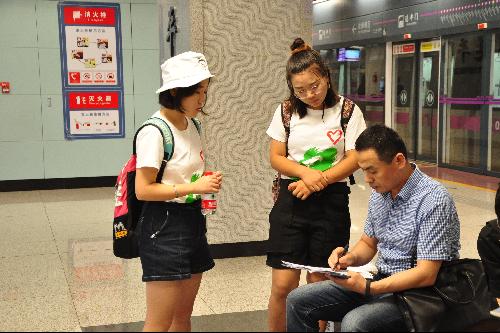 服务队成员来到地铁,依托问卷,展开地下采访,“作为一个西安人,我觉得非常自豪和骄傲,这种历史文化能在每天乘坐的地铁站中展现,真的是很好的”。老人望向钟楼站的文化墙的《大秦腔》向队员说到。当被问及他觉得地铁文化对人们的影响时,老人忽然一下子来了精神,仿佛打开了话匣子,“现代化的发展虽然很好,我们这老一辈的人还是比较喜欢历史,特别是对现在的年轻人,这也算是一种历史文化熏陶吧”。老人感慨道。