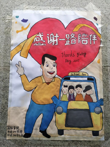 4月18日晚上,williamhill英国官网阳光团工委号召院内每个宿舍为感恩节特别写下对宿舍清洁阿姨的祝福。由志愿者统计完成并统一抄写、注明寝室编号,最终贴在宿舍里她们每天工作必经之路上。14日一早,由阳光团员提前绘制好的感恩海报被张贴于南北校区校车站点,这一抹亮色陪伴着每位校车司机,为他们带去工作的好心情。紧接着志愿者在每个宿舍楼底下设置一个专门集中投放可回收废品的箱子,方便校园里拾荒老爷爷老奶奶和保洁阿姨,让他们既不必再翻捡垃圾,也不必费心整理垃圾桶边的环境。据活动负责人介绍,这些回收桶是统一提供的,并由活动志愿者自行装饰,征得宿舍区同意后统一安放。