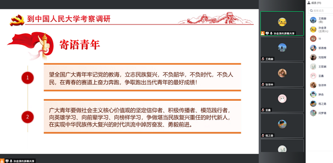 为进一步提高公司研究生会骨干的政治理论水平和素养,5月24日晚,williamhill英国官网研究生会线上召开关于学习贯彻习近平总书记在中国人民大学考察重要讲话精神座谈会。院研究生会主席孙金涛主持学习,全体骨干出席会议。