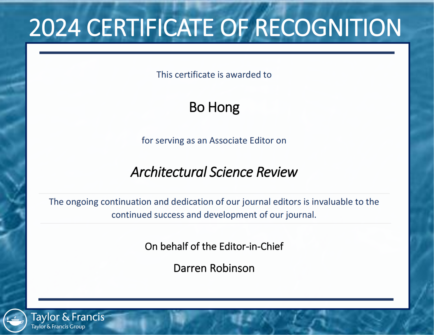 近日,受国际期刊Architectural Science Review主编英国谢菲尔德大学Darren Robinson 教授邀请,公司洪波教授担任该期刊副主编,负责处理期刊热舒适、可持续建成环境领域的稿件。